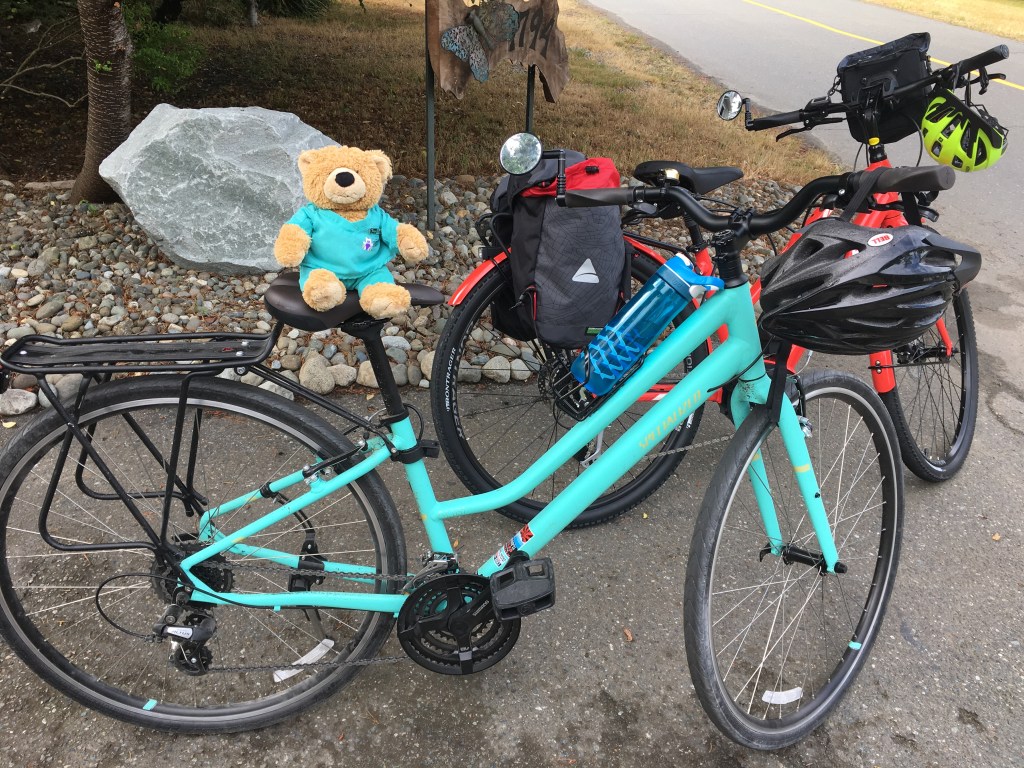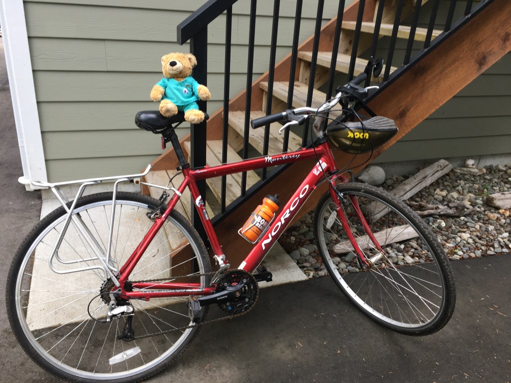 Did you know there is a proper way to start and stop your bicycle? I didn’t know that. I am a novice cyclist and am determined to get comfortable so that I can cycle around Comox and give up AJ’s vehicle – which I hardly ever have to use. But the hills always get my heart fluttering and my legs turn to jello before I can even get to the first portion of the climb. So my wonderful neighbour introduced me to the e-bike. It’s absolutely phenomenal on the hills. But since the bike is heavier, and faster, I realized that I was not used to stopping correctly and had a couple of near falls. That’s when i went to my neighbour for advice. She immediately put on her teacher hat and took me up and down the street till I was semi- proficient.