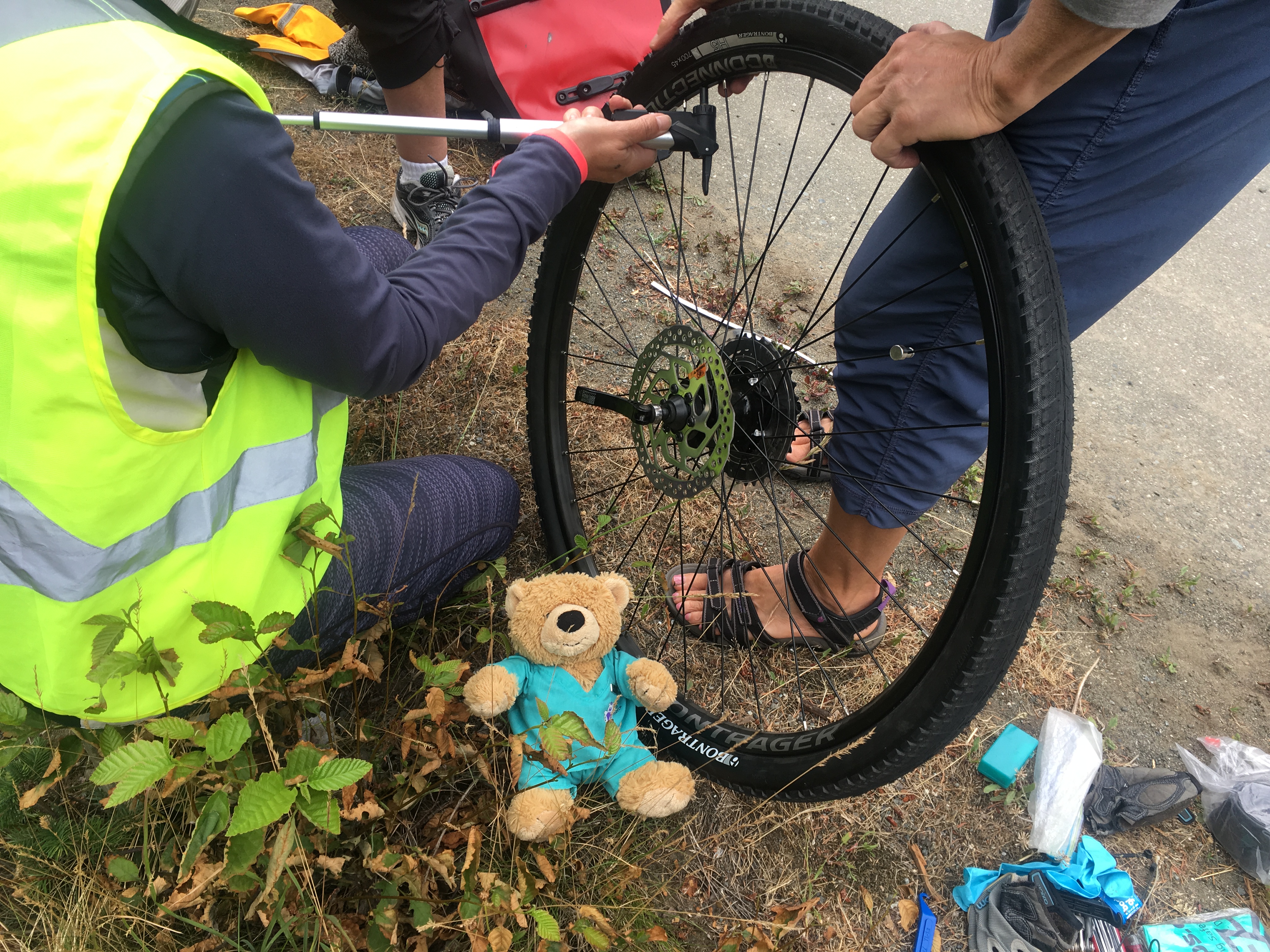 I was getting prepared to abandon our bike ride, but before I knew it, two of the ladies had flipped the bike over, removed the rear wheel tire and were then in the process of removing the tube and finding the puncture. (Apparently it’s really important to know where that is, so that you can determine exactly where on the tire the damage occurred.) Whilst the two were fixing the tire, the third lady was re-directing traffic. Everyone was cool and collected and seemed to know exactly what they were doing.
