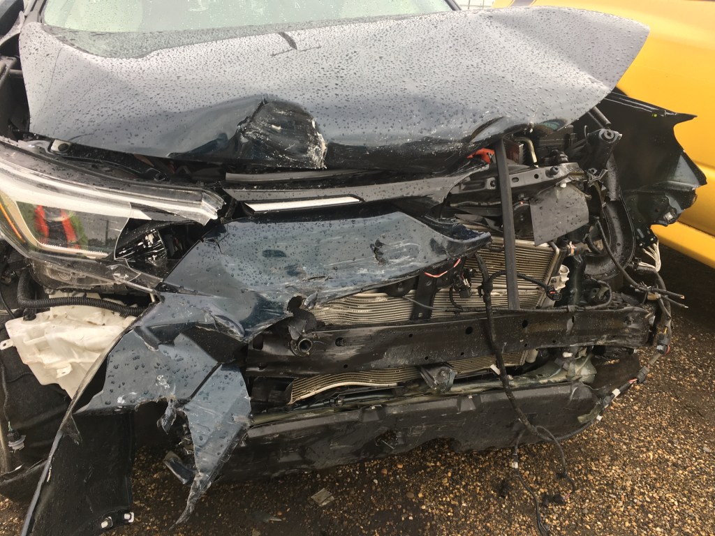 I’ve never been in a motor vehicle collision before. That fact changed this week when i was driving to early morning prayers at 4am. The roads were in perfect condition. There was no traffic. I was proceeding through the overpass at an intersection on a green light when I suddenly struck a vehicle that “came out of nowhere”. I still cannot recall seeing the vehicle. My first memory is of the airbags deploying and I couldn’t see anything as the six airbags in the front and the sides covered all the windows. I smelt the burning powder and my chest hurt and my nose felt on fire. The car spun around and I felt another impact. During this time I recall acknowledging that I had been hit but that I was safe and somehow protected. I thanked God and told HIm that I loved him. Once the car stopped, I realized that I was on an overpass and that I had to get out of my car before I was struck by another vehicle. But how to get out when all the airbags have been deployed and the car is locked down? Neither my driver’s side of the door nor the passenger side of the door would open. Since I had been able to scan myself and assess that I only had minor injuries, I was able to crawl to the back of the car and kick the back door open and get outside.