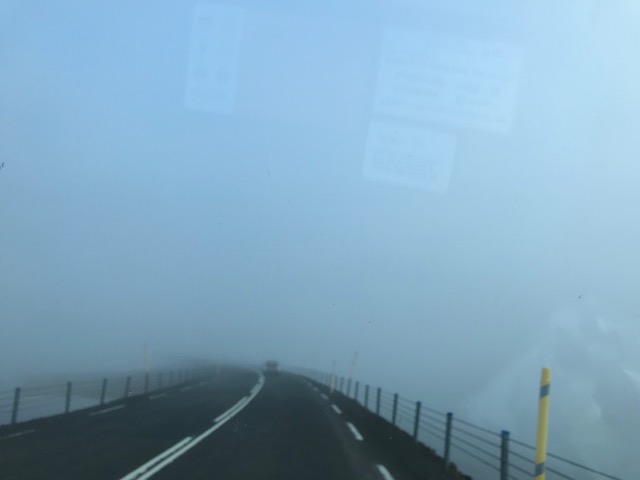 After visiting the falls we drove to Egilsstadir and then to a small town called Seydisfjordur. The drive into Seydisfjordur is supposed to be incredibly scenic and “disappears into otherworldly landscape of mountain ponds” according to Rick Steves. Unfortunately, intense fog rolled in from the ocean and we could barely see the road let alone the icebergs bobbing in Heath Lake on either side of us. The picture below is our view of the drive . My new friend states that the long boarding scene that the stunt double for Ben Stiller from the movie “Secret Life of Walter Mitty” was filmed down this road.